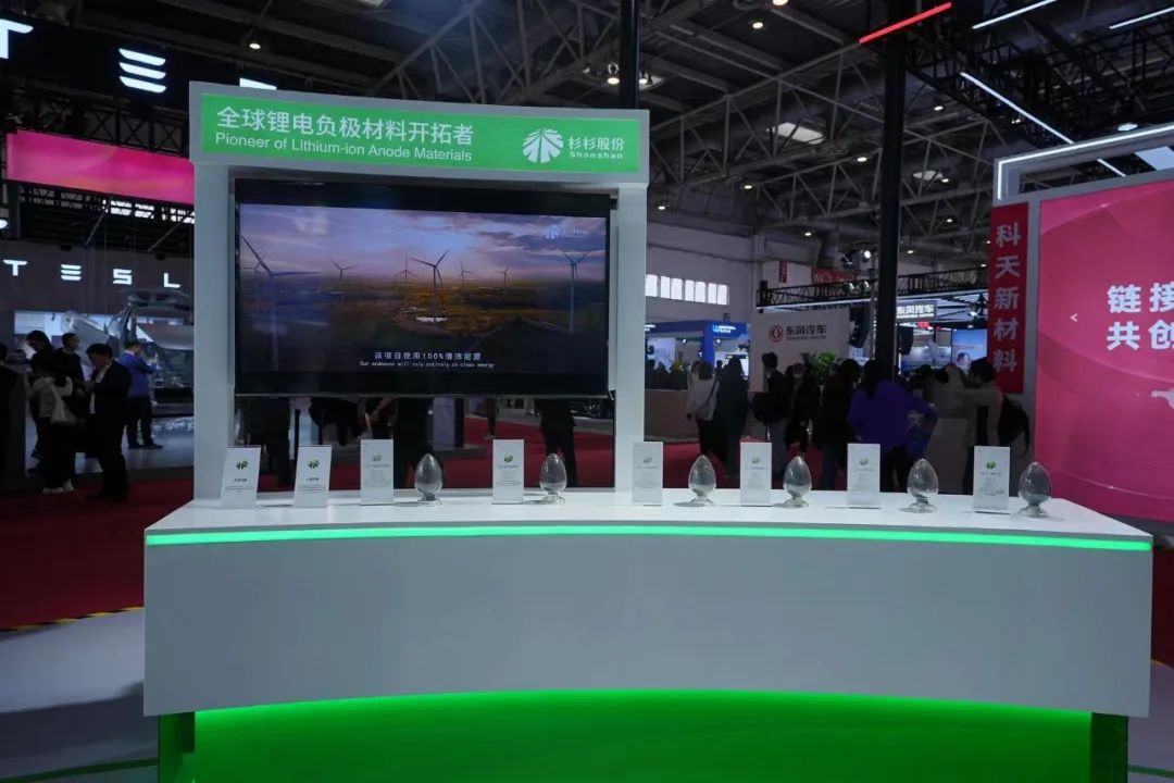 展会现场,杉杉展台展示空间以科技之树开始演变,寓意着杉杉以创新为基石,与世界进行紧密的链接。通过环形屏、透明屏、115寸巨幕TV等新型显示技术,展示了应用于最新一代高端电动车的4C快充负极、行业领先的硅基负极和硬碳负极产品,以及高端LCD、OLED、车载用偏光片等产尖端显示产品,吸引众多观众参观驻足。