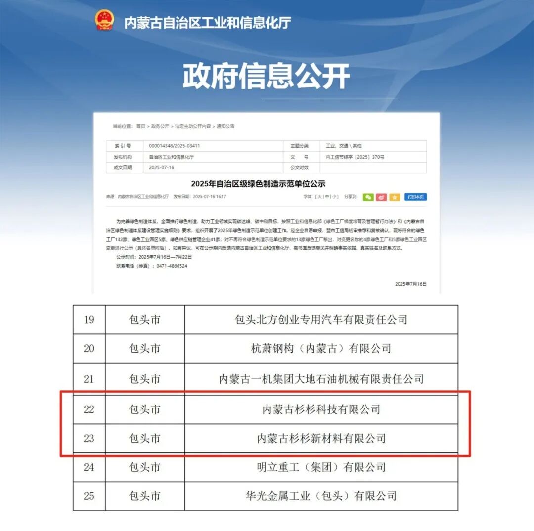 2025年7月16日,经内蒙古自治区工业和信息化厅发布《2025年自治区级绿色制造示范单位公示》,内蒙古杉杉科技有限公司(青山工厂)及内蒙古杉杉新材料有限公司(九原工厂)双双获评内蒙古自治区级“绿色工厂”,使杉杉省级以上绿色工厂再“+2”。