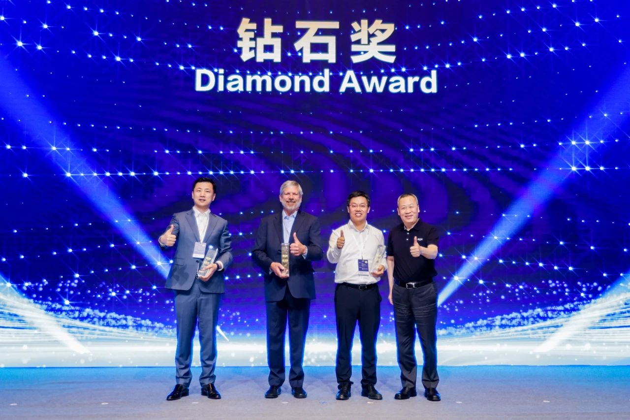 大会就显示技术及物联网技术发展进行深入交流,并对过去一年中做出突出贡献的供应商开展了系列表彰活动。杉金光电从众多供应商中脱颖而出,获全球供应商最高奖——钻石奖。京东方董事长陈炎顺为杉金光电等钻石奖供应商颁奖。颁奖词指出,杉金光电“在技术、品质、服务、成本等方面表现卓越,对BOE(京东方)的成长和发展起到了至关重要的作用”。