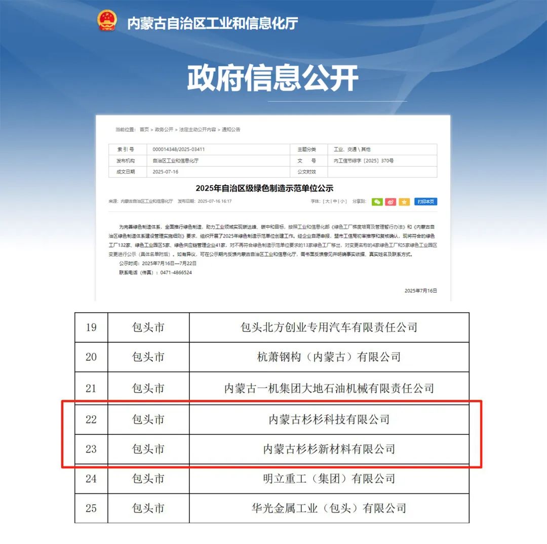 7月16日,内蒙古自治区工业和信息化厅发布《2025年自治区级绿色制造示范单位公示》,内蒙古杉杉科技有限公司及内蒙古杉杉新材料有限公司成功获评“绿色工厂”。标志着企业在履行环保社会责任方面获得政府部门认可,也为地区完善绿色制造体系,助力实现“双碳”目标作出贡献。