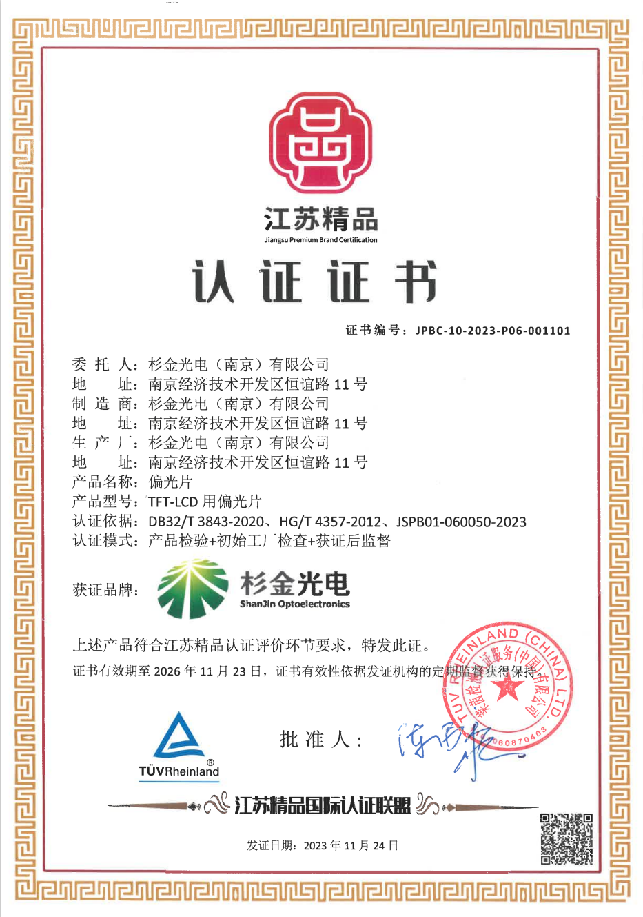 杉金光电自成立以来,一直致力于偏光片技术的研发和创新,凭借强大的技术实力和严格的质量管理体系,为众多客户提供高品质的产品和服务。此次荣获“江苏精品”认证,不仅是对杉金光电过去努力的认可,更是对公司未来发展的极大鼓舞。