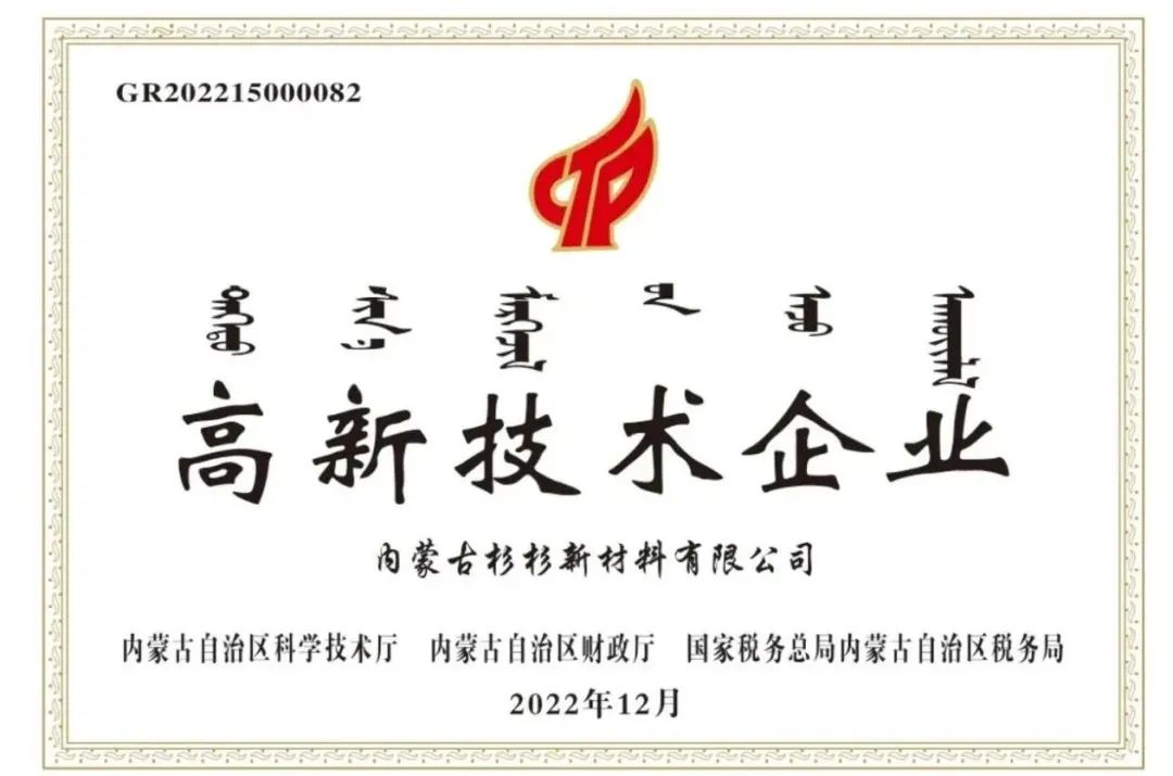 内蒙古杉杉新材料坚定不移推进自主创新之路,积极开展技术管理创新工作;通过引进新技术、新工艺、新设备,持续加大创新投入,引进高端技术人才,推动全员创新提效。凭借在负极材料石墨化研发与生产上的行业领军优势,经过严格评估和认定,获得内蒙古自治区科学技术厅、财政厅、国家税务总局内蒙古自治区税务局联合颁发的“高新技术企业”称号。